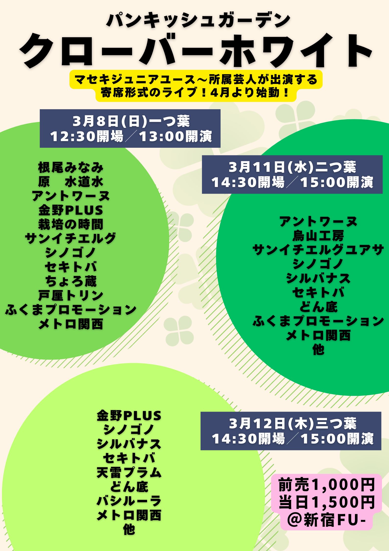 一つ葉のクローバーホワイト:4月11日(土)14:00開演 二つ葉のクローバーホワイト:お休み 三つ葉のクローバーホワイト:お休み |